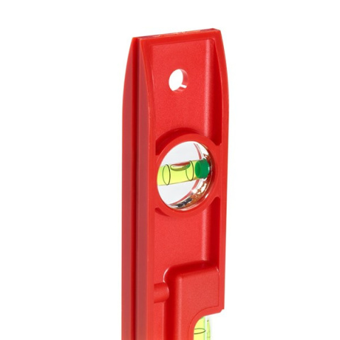 Udaroodporna poziomnica z czerwonego polistyrenu, odporna na temperatury w zakresie od –15°C do +60°C. Nietłukące libelle blokowe, charakteryzujące się idealną przezroczystością i wyjątkową trwałością. Libella pozioma z płytką odblaskową. W spodniej części rowek w kształcie V, umożliwiający używanie na rurach.