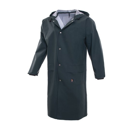 Płaszcz wodoochronny wykonany z tkaniny Probaltic (dzianina poliestrowa powlekana polichlorkiem winylu), o masie powierzchniowej 350 g/m2 - odpornej na zginanie w niskich temperaturach (do - 50 st C). Płaszcz o prostej konstrukcji i długości do łydki. Zapinany na nierdzewne guziki zatrzaskowe. U góry wykończony kapturem ściąganym sznurkiem z regulacją za pomocą stoperów. Rękawy jednoczęściowe proste, zakończone wiatrołapem z gumką. Dwie kieszenie dolne zgrzewane, kryte patką. Szwy zgrzewane prądem wysokiej częstotliwości. Spełnia wymagania normy EN 13688, EN 343.